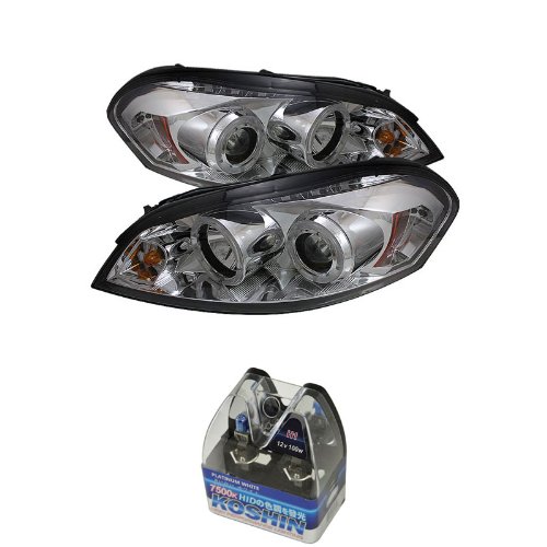 FeaturesThis special package deal comes with a pair of Spyder Projector headlights and a pair of Koshin Platinum White Halogen Light Bulbs; Item shown are the exact item you will receiveApplication is straight-forward, the mounting point is identical to the OEM headlights, and it using a plug and play installation method for the low and high beam(no soldering or splicing of the wires involved with two exception for the halo rings and led). The Low and high beam bulb size are different than the original light. Headlights are designed for specific year, and model, please refer to the description for detail applicationPackage also include 2 high power bulbs to replace your low beam for better visibility and contrast, The Platinum White Halogen Light Bulbs is direct replacement to the housing no modification is requireOutput for these Koshin light bulbs is 12V 100W, 7500K RatingPlease refer to item description to ensure that this part fits your make and model. Orders placed by mistake are subject to a restocking fee when returned. Inquire with our customer service representatives for details Carpart4u Chevy Impala / Chevy Monte Carlo 06-07 Halo LED Projector Headlights & Koshin Platinum White Halogen Light Bulbs package?