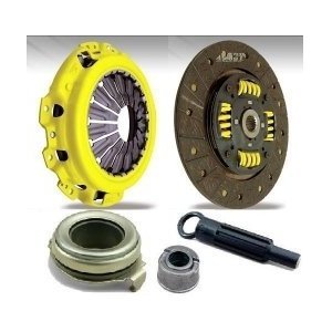 #This ACT clutch kit includes a Heavy Duty pressure plate, Performance Street disc, release bearing, pilot bearing and alignment tool. The Heavy Duty pressure plate allows for a 20 to 50 percent increase in clamp load over the stock unit. ACT's Heavy Duty pressure plate features precision CNC machined parts, drive straps and rivets to securely locate contact face to the cover for quiet, trouble-free operation. The Heavy Duty pressure plate will have a stock to moderate pedal feel. ACT pressure plates feature creative diaphragm designs to increase clamp load, reduce deflection and maximize clutch life. All diaphragms endure an exclusive four-stage, heat-treating process for unparalleled performance. The Heavy Duty pressure plate meets SFI Specification 1.1. ACT Performance Street discs are modified with reduced marcel for faster shift action to complement ACT pressure plates. Performance Street discs have higher copper content friction lining for heat tolerance and steel-backed lining for greater burst strength and durability. Also, they feature top grade rivets to securely fasten the part together. The rivet design and rivet materials are carefully selected for maximum strength. ACT spring-centered assemblies use bushings and cone springs similar to factory clutch discs. This creates frictional dampening which improves clutch life and reduces noise. All Performance Street discs are certified as meeting SFI Specification 1.1 and are legal in all racing organizations that require SFI certification. The kit is completed with a quality, stock replacement release bearing, pilot bearing and alignment tool.